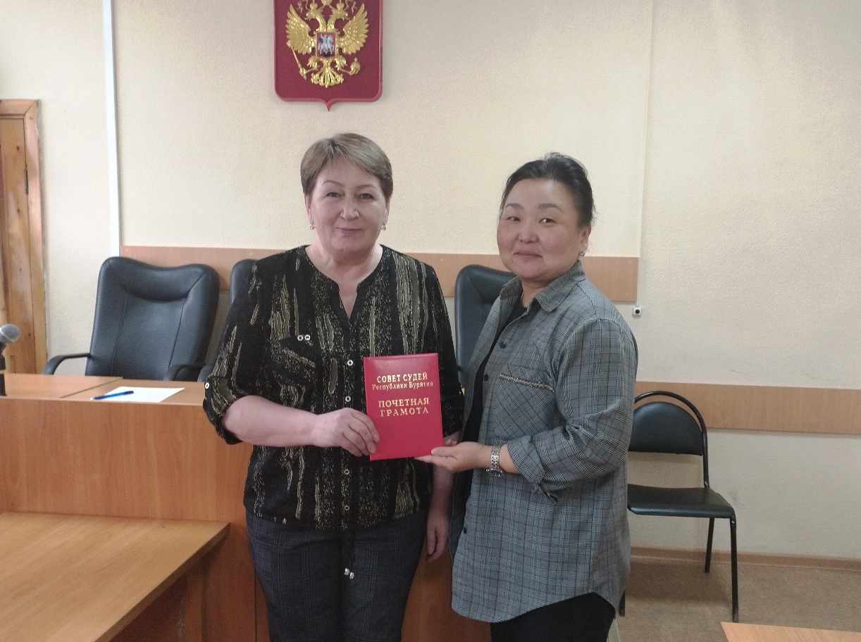 Секретарь судебного заседания Кабанского районного суда Республики Бурятия Соболева Елена Ивановна награждена Почетной Грамотой Совета судей Республики Бурятия за длительную и безупречную службу в судебной системе.