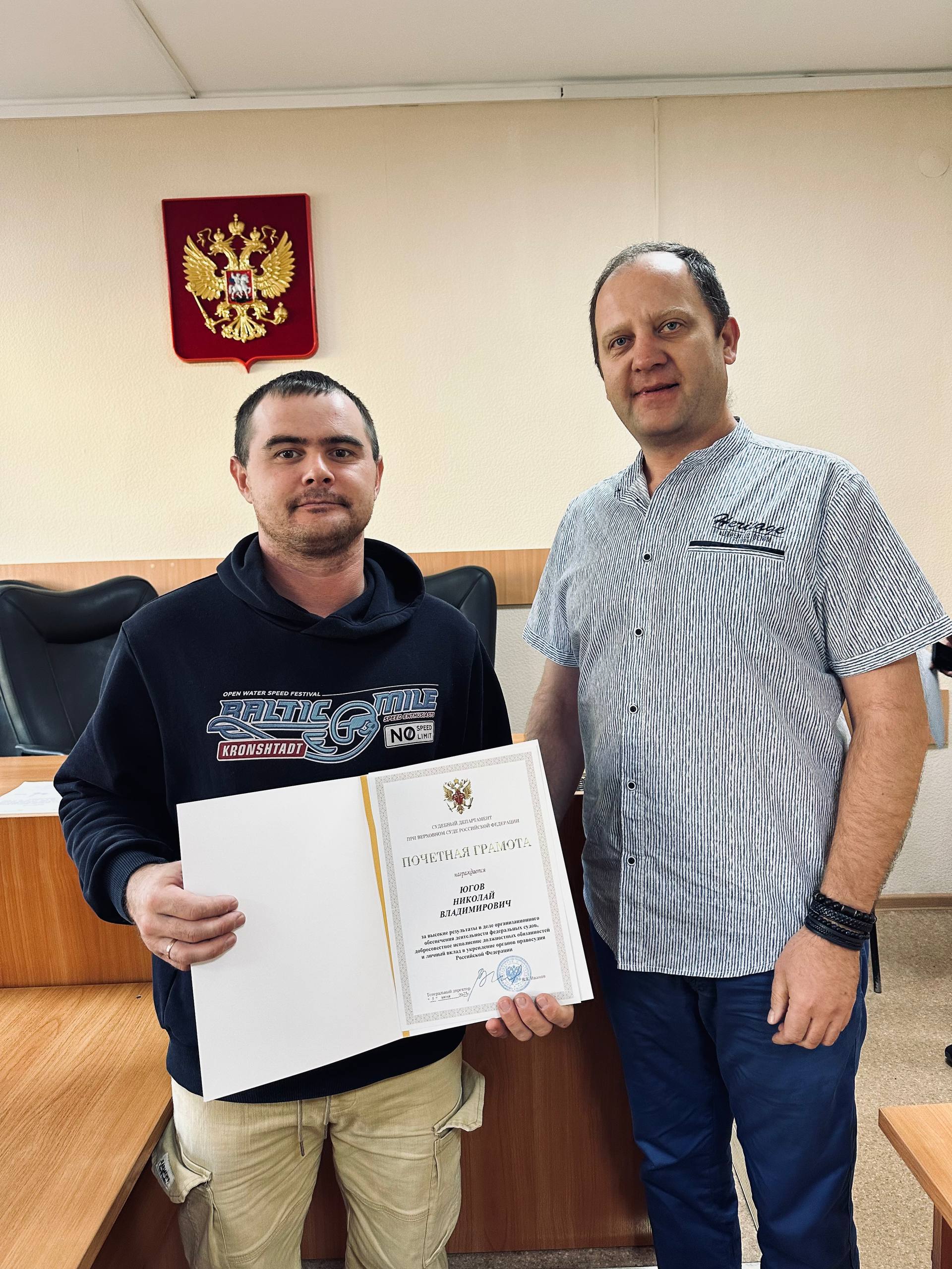 О награждении Курьер Кабанского районного суда Республики Бурятия Югов Николай Викторович награжден Почетной грамотой Судебного департамента при Верховном Суде Российской Федерации за высокие результаты в деле организационного обеспечения деятельности федеральных судов, добросовестной исполнение должностных обязанностей и личный вклад в укрепление органов правосудия Российской Федерации. ![]() |